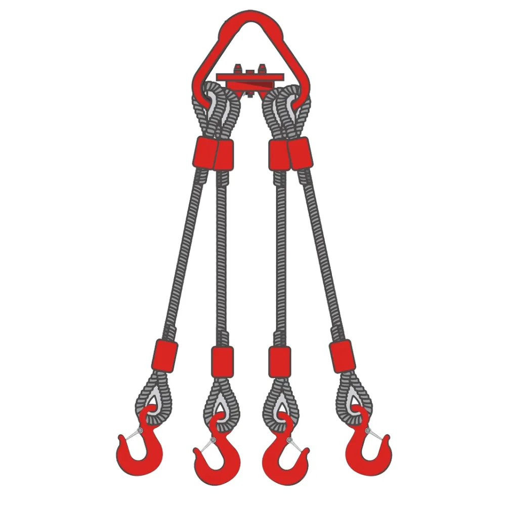 Строп канатный четырехветвевой 4СК производства Р-Системс г/п 20 т, длина 5,5 м, произведенный из троса диаметром 31 мм, покрытие оцинкованное — это канатное изделие с четырьмя ветвями, на концах которых созданы огоны путем крепления металлической втулкой и механического соединения с использованием прочных коушей, которые во много раз увеличивают продолжительность жизни стропа, предохраняя канат в местах соединения и позволяют выдерживать большие нагрузки. Ветви скреплены между собой продолговатым ведущим кольцом, а их концы укомплектованы надежными коваными крюками с затворами, которые создают дополнительную безопасность.
