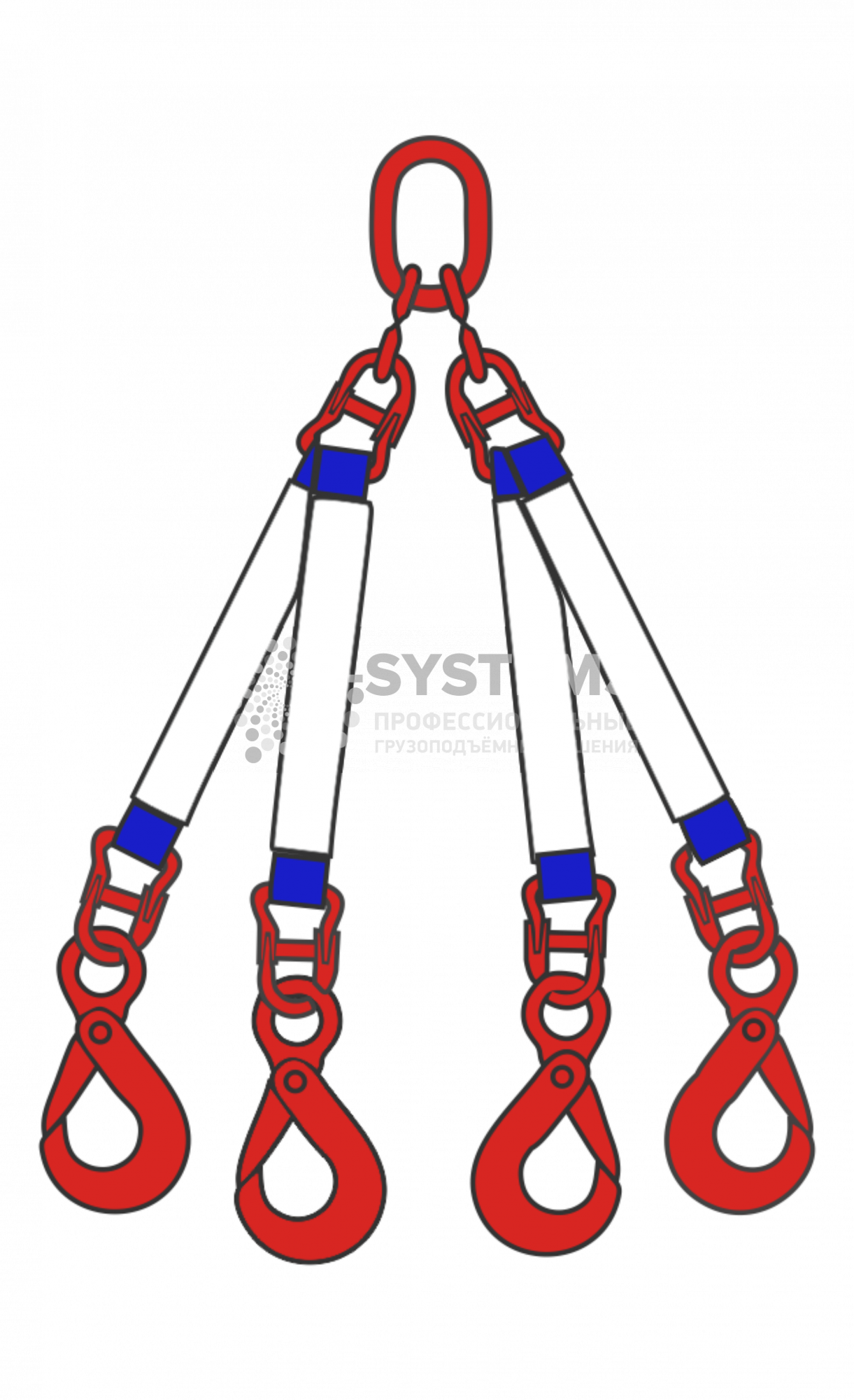 Такое изделие представляет собой четыре несущие ветви (по сути ленточные одноветвевые стропы 1СТ), которые соединены между собой особым подвесным овальным звеном. Петлевые концы каждой ветви снабжены грузозахватными приспособлениями (концевыми фитингами) — это могут быть скобы, захваты, а чаще всего грузовые крюки с защелкой или самозакрывающимся затвором. Условия по изготовлению и применению текстильных четырехветвевых строп установлены требованиями Госгортехнадзора в РД-24-СЗК-01-01, ТУ 5225-010-91978384-2011 и другими документами. Плоские ленты строп производятся из высокопрочного полиэстера и способны выдержать серьезную нагрузку с коэффициентом запаса прочности 7:1.
